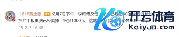 据@1818黄金眼 官微音书,当今此事一经有了最终说明:2月7号下昼,李师父响应,平台一经把3000块钱退给他了,包装好像的平板电脑一经卖掉,折损1000元,这笔钱由门店和平台各承担一半。